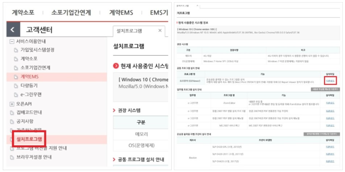 화면 좌측 상단을 살펴보면 설치 프로그램 메뉴를 발견할 수 있다. 여기에서는 우체국 서비스를 이용할 때 필요로 하는 각종 소프트웨어를 제공하고 있다. 공통 프로그램 설치 안내를 보면 오즈뷰어(OZViewer)를 찾을 수 있었다. 오른쪽에 보이는 다운로드 버튼만 눌러주면 간단히 설치 파일을 내려받고 인스톨을 진행할 수 있다.